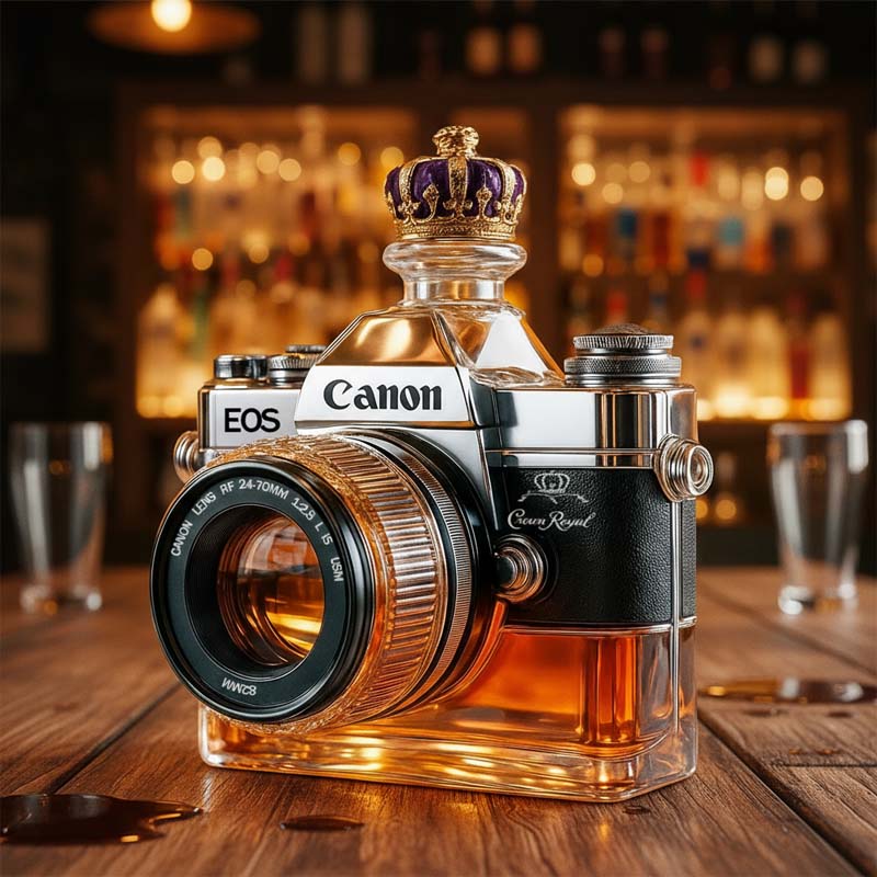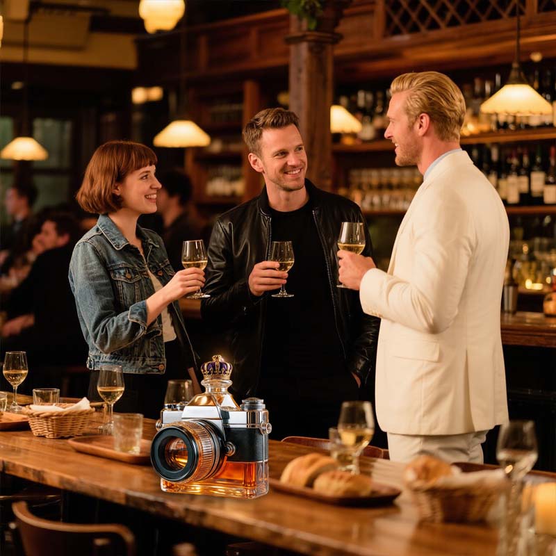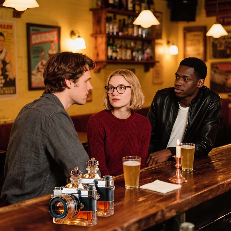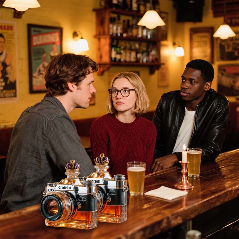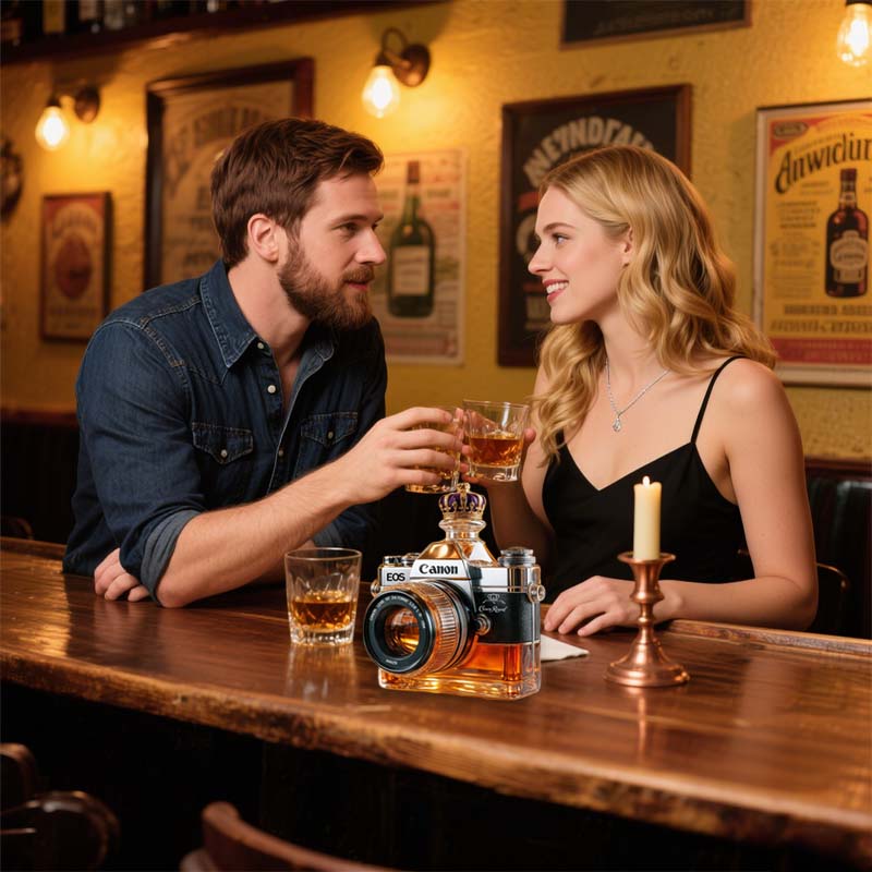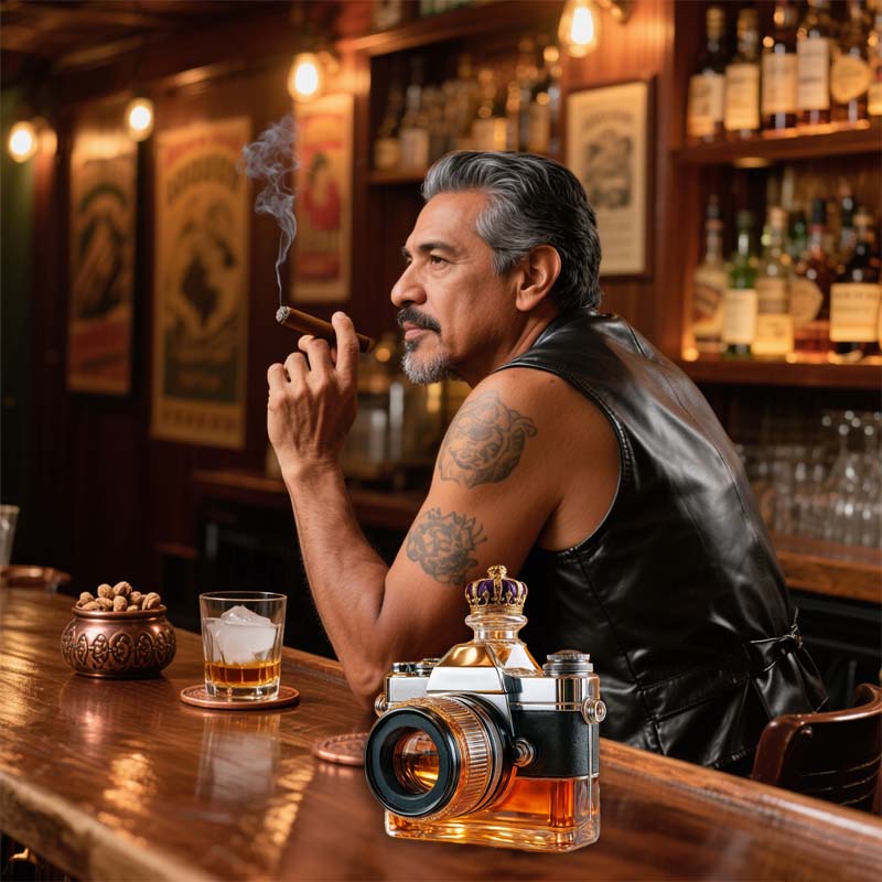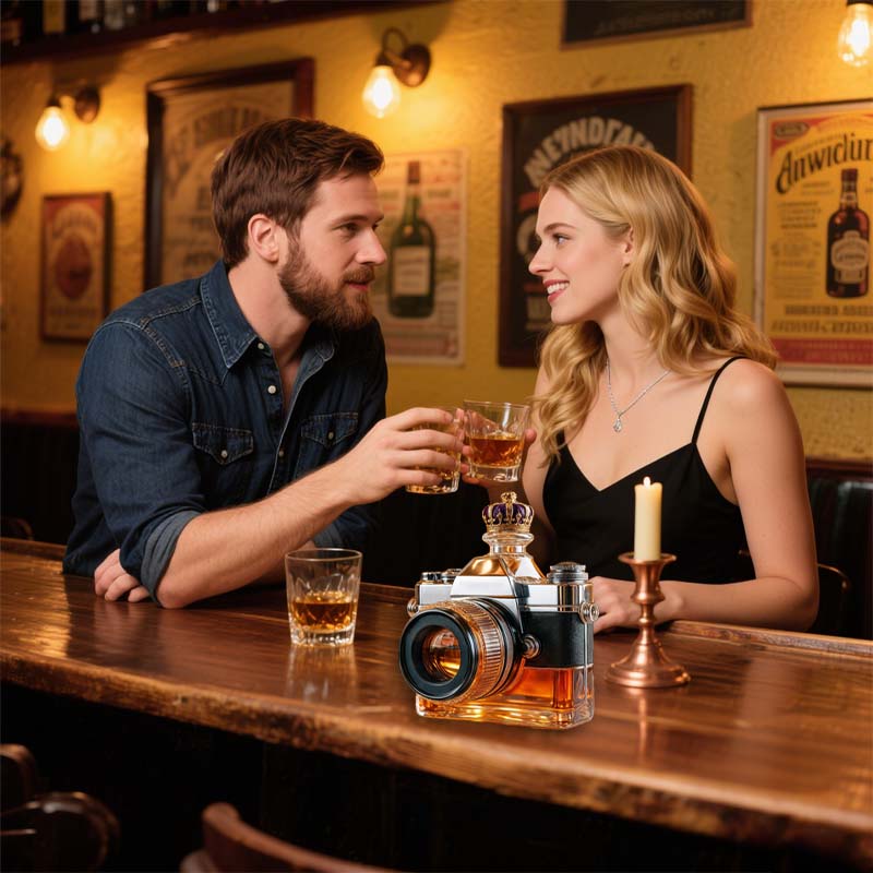 Hvorfor nøjes med et almindeligt glas, når du kan indramme din drink som et mesterværk? Denne kameraglasflaske inviterer dig til at holde en pause, beundre og måske tage et billede, før du tager den første slurk.